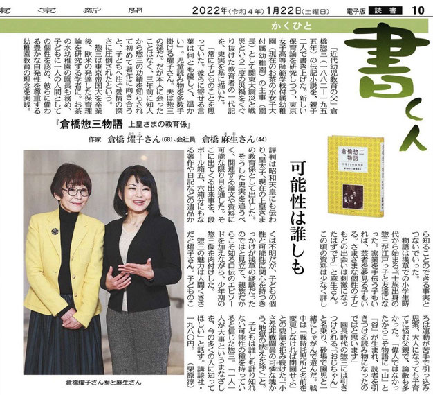 『倉橋惣三物語』著者の倉橋燿子さん、倉橋麻生さんが倉橋惣三について語ったインタビュー記事が「書く人」欄に掲載されました。